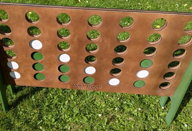 Klasiska stratēģijas spēle diviem vai vairākiem spēlētājiem. Mērķis – pirmajam izveidot 4 savas krāsas ripiņas vienā rindā – horizontāli, vertikāli vai pa diagonāli. Spēle ir ātra, aizraujoša un attīsta loģisko domāšanu. Izmēri 150cm -80 cm, komplektā 21 balta/21 zaļa ripa.