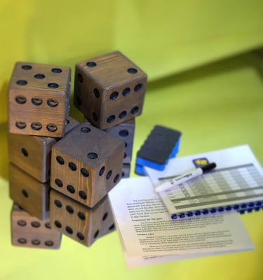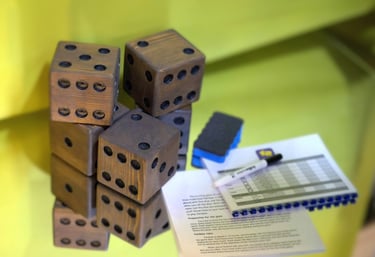 🎲 Aprīkojums: 5 lieli kauliņi; maisiņš kauliņu mešanai