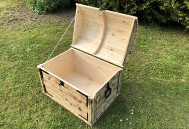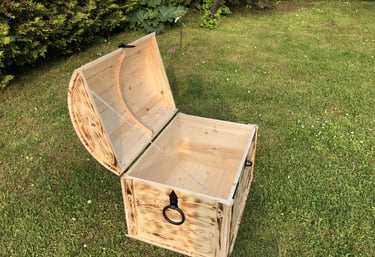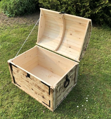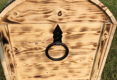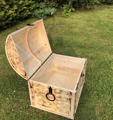 Koka pūre lāde ar izteiktu apdedzināto apdari un melniem dekoratīviem rokturiem ir elegants elements, kas iederēsies gan rustikālā, gan svinīgā vidē. Lāde viegli atveras, atklājot dziļu, tukšu iekšieni, kas piemērota dāvanu uzglabāšanai, dekorācijai vai pasākumu rekvizītiem. Tā siltā koka tekstūra un nostalģiskā forma piešķir pasākumam raksturu un vizuālu uzmanības centru.