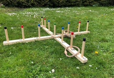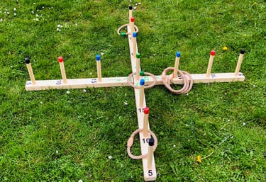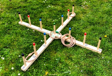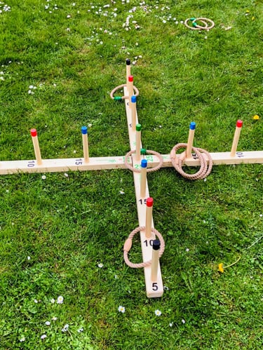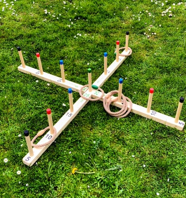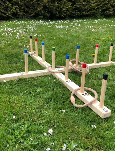 Džutas auklas mešanas spēle ir vienkārša, jautra un sacensību pilna āra spēle, kur spēlētāji met riņķus uz stabiņiem ar dažādiem punktu vērtējumiem. Ideāli piemērota kāzām, ballītēm, team building un ģimenes pasākumiem.