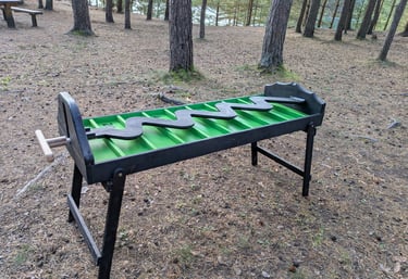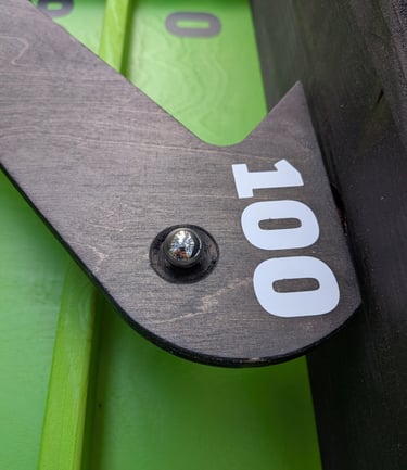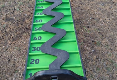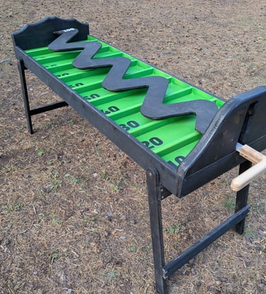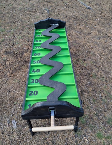 🎯 Dēlis ar zigzag rievu uz koka platformas ar punktu zonām: 10, 20, 30, 40, 50, 60, 70, 80, 90, 0; zig zag pašā galā = 100.