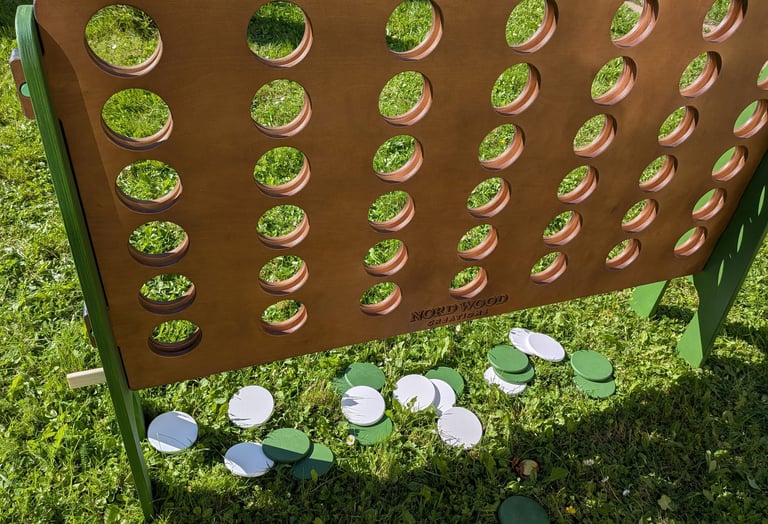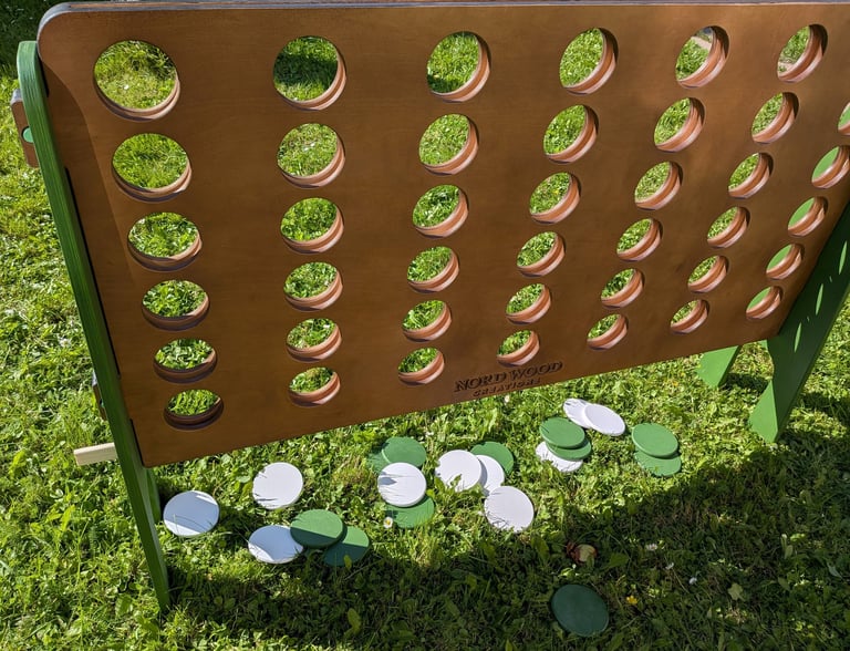 Klasiska stratēģijas spēle diviem vai vairākiem spēlētājiem. Mērķis – pirmajam izveidot 4 savas krāsas ripiņas vienā rindā – horizontāli, vertikāli vai pa diagonāli. Spēle ir ātra, aizraujoša un attīsta loģisko domāšanu. Izmēri 150cm -80 cm, komplektā 21 balta/21 zaļa ripa.