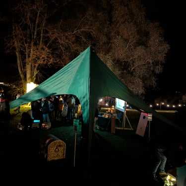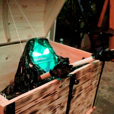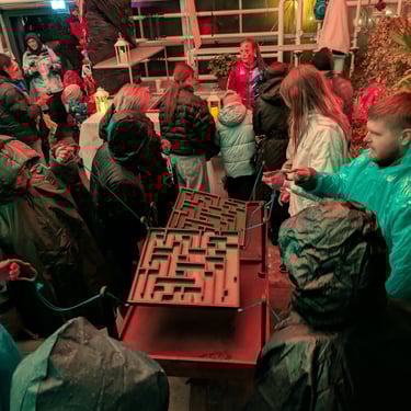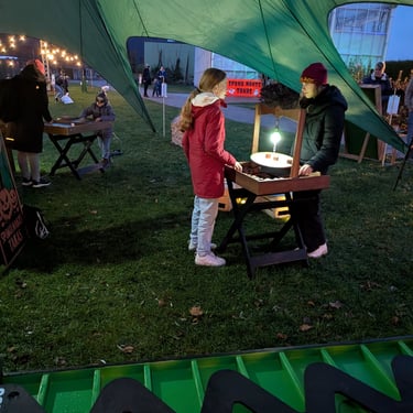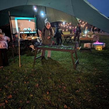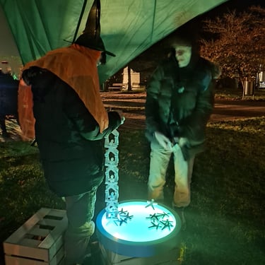 Pirmās dienas rīts sākās agri, ar pēdējiem uzlabojumiem un tematisku noformējumu. Mūsu 12 dažādās koka spēles tika pielāgotas Helovīna noskaņām, un katra no tām ieguva savu “spocīgo” raksturu. Īpašu uzmanību piesaistīja PŪRA LĀDE, kuru pārvērtām par Pandoras lādi — ar melnu spociņu, zilām degošām acīm un auklas mehānismu, kas izstiepa rokas, kad lāde tika atvērta. Pievienojām arī skaļruni ar pulti, kas izdeva baisas skaņas. Rezultāts? Smiekli, izbīlis un sajūsma gan bērniem, gan vecākiem — īsts “wow” efekts, kas lika pasmaidīt pat visbaisākajiem spokiem. Veidojām informatīvo materiālu priekš projektora ar dažādiem mošķa video ,kas bija apvienoti ar mūsu spēlēm,kā arī centāmies pabeigt mazās lietas ,kas vienmēr aizņem visvairāk laika.