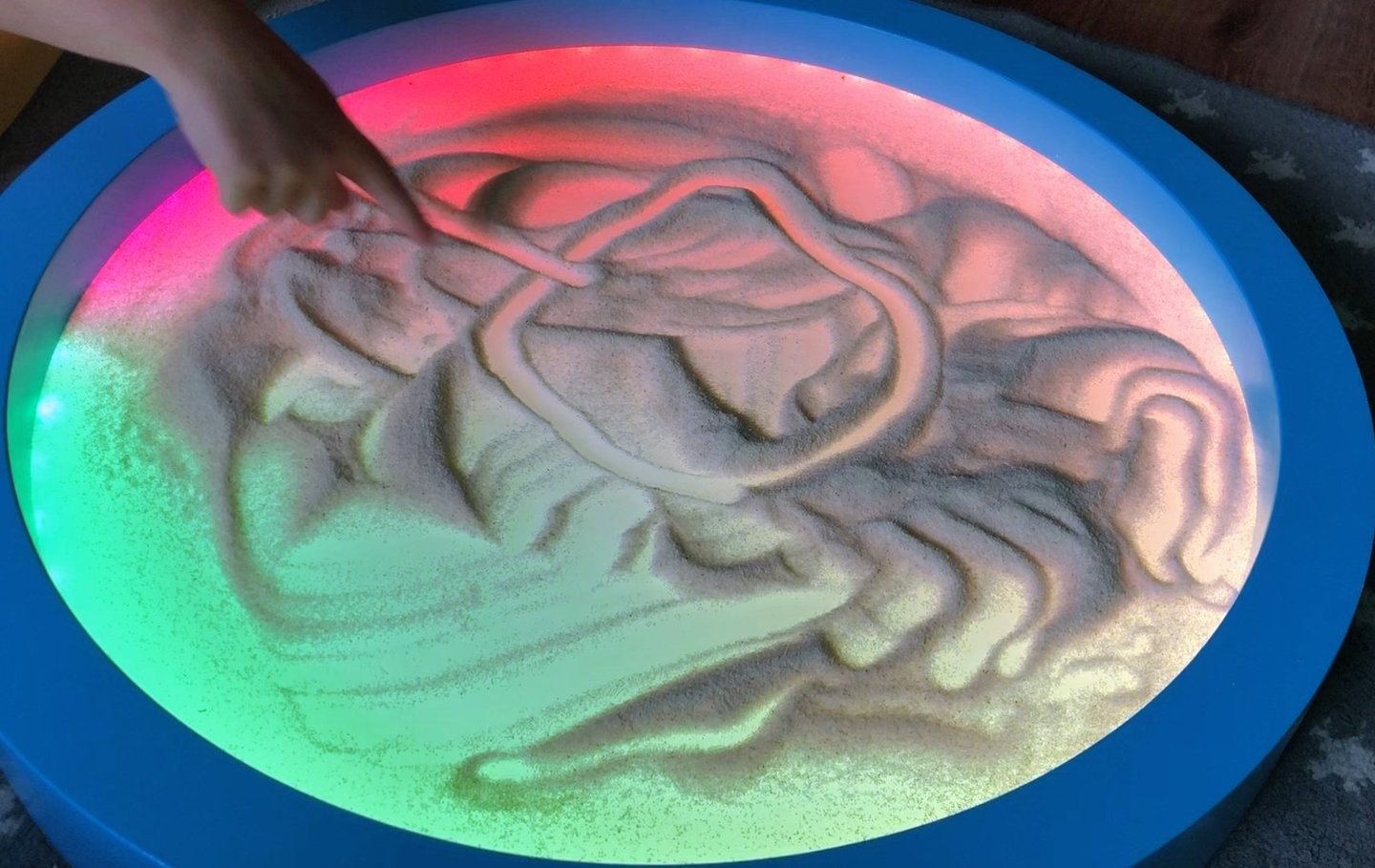 🌿 Dabiski materiāli un drošs dizains Izgatavota no kvalitatīta koka ar gludām malām un dziļi zilas gaismas efektu, kas piešķir spēlei maģisku noskaņu. Smilšu kaste ir piemērota gan telpām, gan āra pasākumiem.