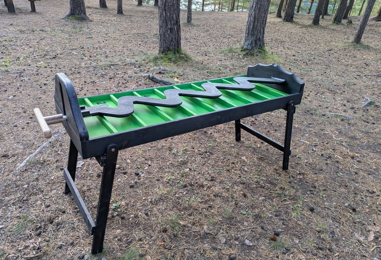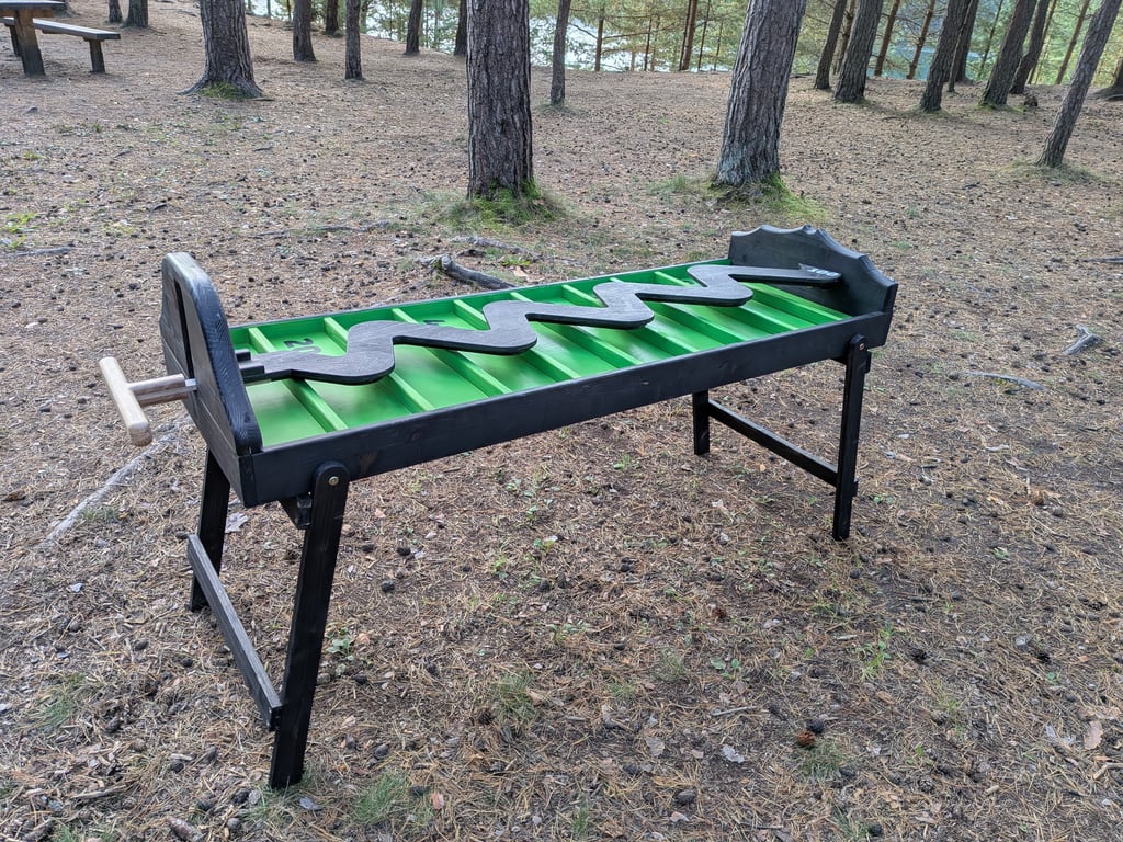 🎯 Dēlis ar zigzag rievu uz koka platformas ar punktu zonām: 10, 20, 30, 40, 50, 60, 70, 80, 90, 0; zig zag pašā galā = 100.